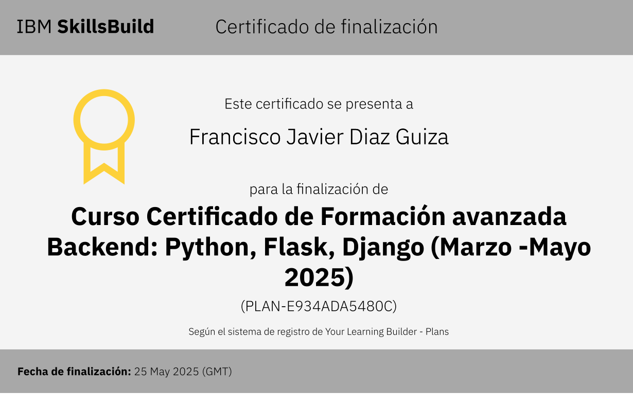 Mi base como desarrollador backend se construyó a través de varias formaciones centradas en Python y desarrollo web. Estos programas me permitieron adquirir una comprensión sólida del lenguaje, de los frameworks más utilizados y de las buenas prácticas necesarias para desarrollar aplicaciones reales.